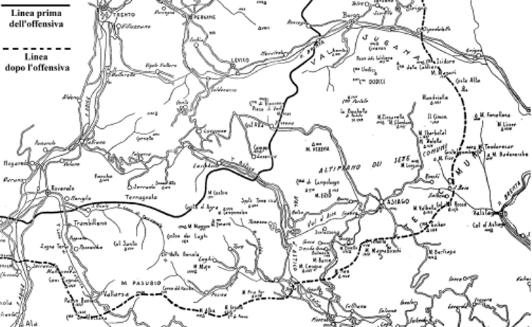 After the easy early successes, the fast arrival of large Italian reinforcements slew down the offensive to a stop, and after the last useless assaults to the most advanced strongpoints near the Vicenza plain, it was definitively stopped, to divert forces against the Russian offensive under general Brusilov in Galizia.